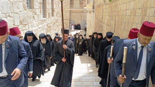Ὑψώνω τό ποτήριον ὑπέρ ὑγιείας καί μακροημερεύσεως τοῦ Πατρός καί Πατριάρχου ἡμῶν κ.κ. Θεοφίλου τοῦ Γ΄ καί πάσης τῆς Ἁγιοταφιτικῆς Ἀδελφότητος. Χριστός Ἀνέστη. Χρόνια πολλά».