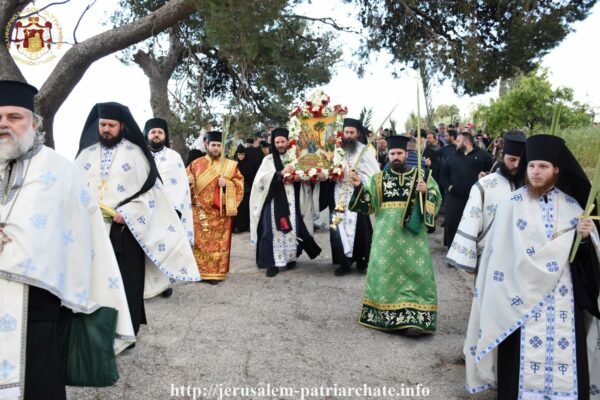 Ένα έθιμο που κρατάει από την εποχή της Αγίας Ελένης μέχρι και σήμερα αμαβίωσε και φέτος στην Αγία Γη. Η λιτανεία των Βαΐων ξεκινάει από τη Βησφαγή και καταλήγει στην Ιερά Μονή Θεοπατόρων Ιωακείμ και Άννης.