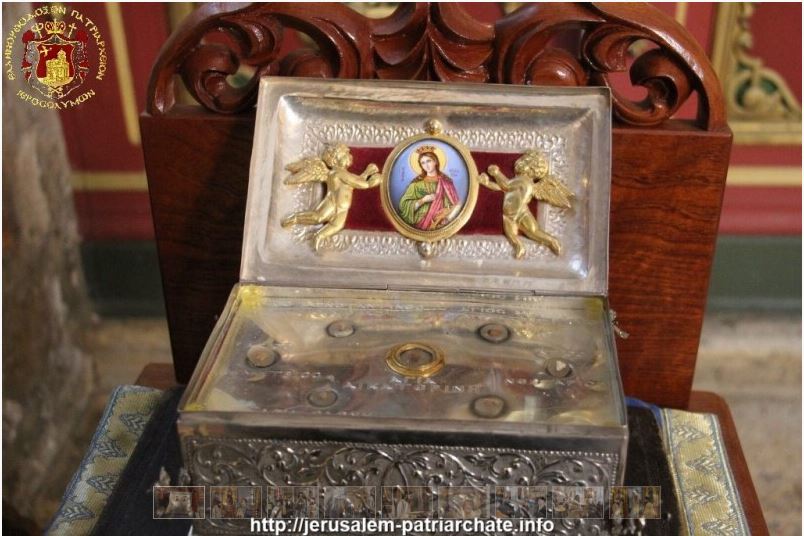 Το ιερό λείψανο της Αγίας φυλάσσεται στην Ιερά Μονή του Σινά, «ένθα και λαμπρώς εορτάζεται η μνήμη αυτής μετ᾽ αντιπροσωπείας του Πατριαρχείου Ιεροσολύμων, ουχί όμως το έτος τούτο, λόγω της λοιμώδους νόσου του Covid 19».