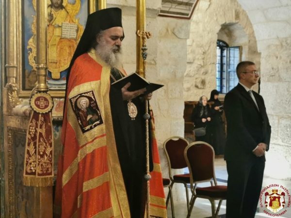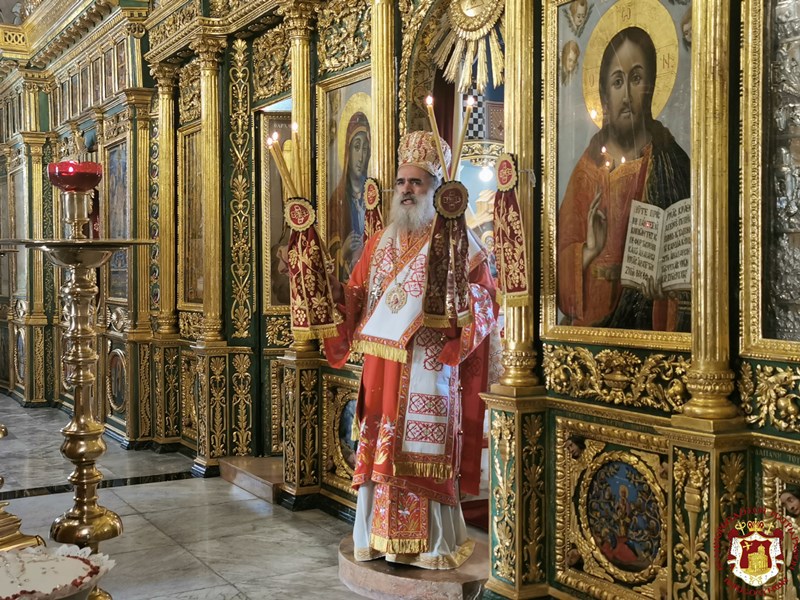 Διαρκούσης τῆς θείας Λειτουργίας προσῆλθε μετά Πατέρων Ἁγιοταφιτῶν διά προσκύνησιν ἡ Α.Θ.Μ. ὁ Πατήρ ἡμῶν καί Πατριάρχης Ἱεροσολύμων κ.κ. Θεόφιλος.