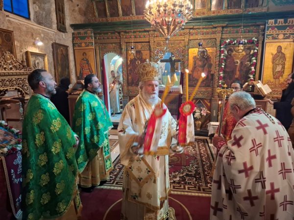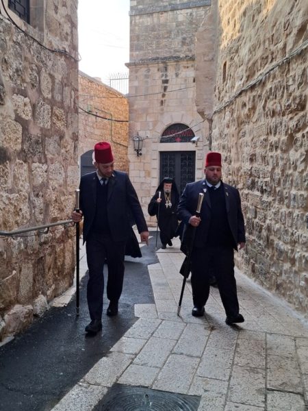 Διαρκούσης της Θείας Λειτουργίας προσήλθε διά προσκύνησιν η Α.Θ.Μ. ο Πατήρ ημών και Πατριάρχης Ιεροσολύμων κ.κ. Θεόφιλος μετά Πατέρων Αγιοταφιτών.