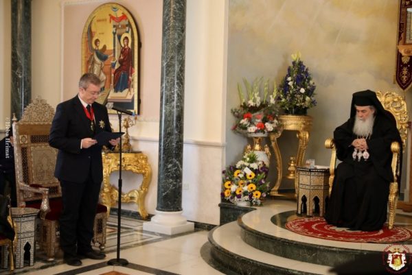 Εξ ονόματος της Ελληνικής Πολιτείας, τον σεβασμό και την ευγνωμοσύνη προς το πρόσωπό του Μακαριωτάτου για το ποιμαντικό έργο, για το σημαντικό έργο της διαφύλαξης και ανάδειξης των Ιερών προσκυνημάτων της Πίστης μας στους Αγίους Τόπους, για την προάσπιση των δικαίων και δικαιωμάτων του καθ’ ημάς Πατριαρχείου και για τη διαφύλαξη της Ελληνικής και Ελληνορθοδόξου παρουσίας στην Αγία Γη εξέφρασε ο Γενικός Πρόξενος της Ελλάδας στην Ιερουσαλήμ, κ. Ευάγγελος Βλιώρας.