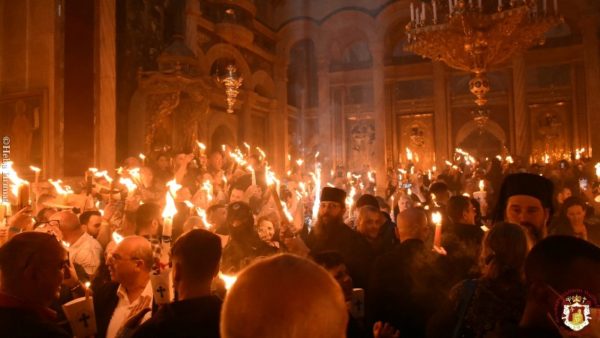 Ἱερεῖς, μοναχοί καί λαός ἔλαβον ἐν χαρᾷ καί ἀγαλλιάσει διά τῶν κηρῶν αὐτῶν τό Ἅγιον Φῶς καί προσῆψαν αὐτό εἰς χείλη, ὄμματα, μέτωπα ζητοῦντες τήν ἄνωθεν ἐνίσχυσιν καί τόν φωτισμόν παρά τοῦ Αναστάντος Χριστοῦ.