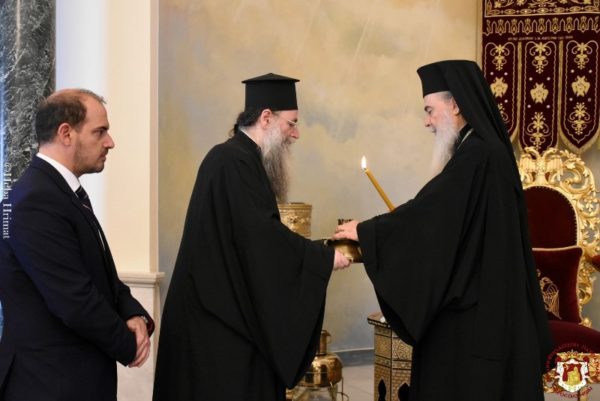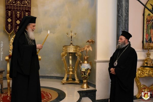 Ακολούθως ο Μακαριώτατος εισήλθε υψών αναμμένους τους πυρσούς στο Καθολικό και από το Καθολικό στο Ιερό Βήμα και εν συνεχεία στο Σκευοφυλάκειο.