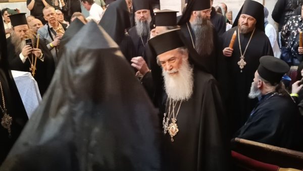 Ἀκολούθως ὁ Μακαριώτατος εἰσῆλθεν ὑψῶν ἀναμμένους τούς πυρσούς εἰς τό Καθολικόν καί ἀπό τό Καθολικόν εἰς τό Ἱερόν Βῆμα καί ἐν συνεχείᾳ εἰς τό Σκευοφυλάκειον.