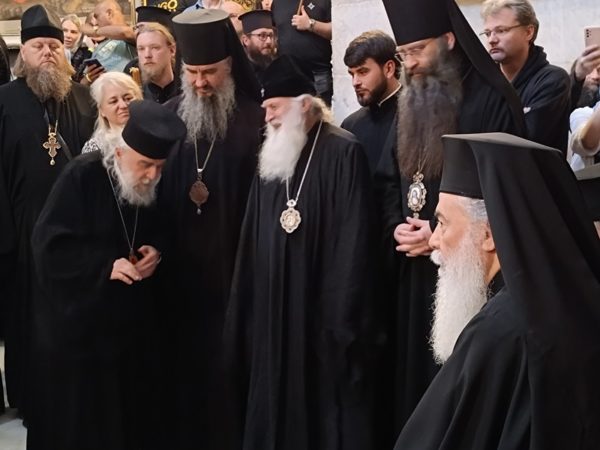 Αφού προσκύνησε την Αγία Αποκαθήλωση προσήλθε στον Ιερό Βήμα του Καθολικού, όπου ήλθαν και οι τρεις Κοινότητες των Αρμενίων, Κοπτών και Συριανών και έλαβαν την ευλογία να λάβουν το Άγιον Φως.