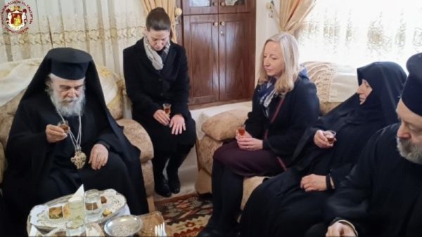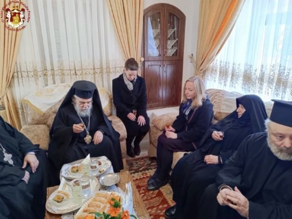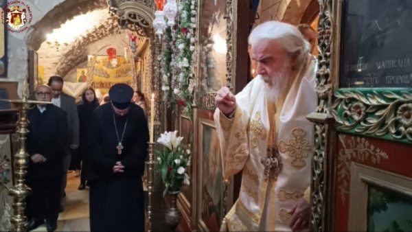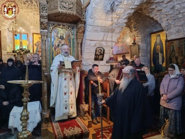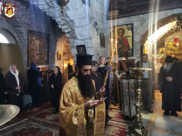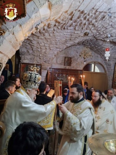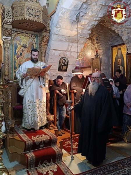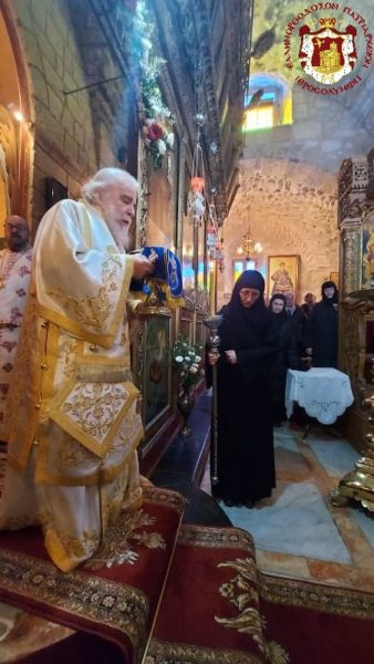 Κατά τη διάρκεια της Θείας Λειτουργίας ο Μακαριώτατος Πατριάρχης Ιεροσολύμων κ.κ. Θεόφιλος επισκέφθηκε την Μονή όπου προσκύνησε μαζί με Αγιοταφίτες Πατέρες.