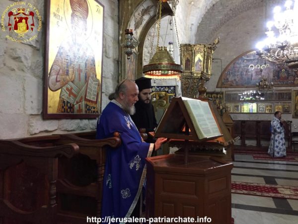 Αυτόν τον μέγα φωστήρα του Αγίου Πνεύματος τίμησε η Εκκλησία των Ιεροσολύμων στο προαναφερθέν παρεκκλήσιο με Εσπερινό χθες το απόγευμα, υπό του Γέροντος Καμαράση Αρχιμανδρίτου π. Νεκταρίου και με θεία Λειτουργία, σήμερα το πρωί, την οποία τέλεσε ο Σεβασμιώτατος Αρχιεπίσκοπος Κωνσταντίνης Αρίσταρχος, με συλλειτουργούς τον Αρχιδιάκονο Μάρκο και ψάλλοντες τον Ιεροδιάκονο Συμεών και την μοναχή Κυριακή.