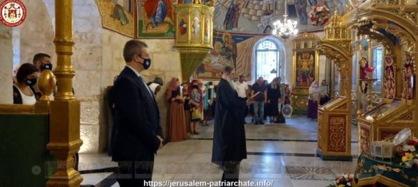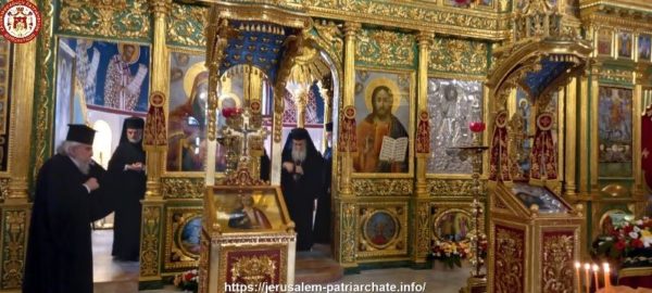 Διαρκούσης της Θείας Λειτουργίας προσήλθε για προσκύνηση η Α.Θ.Μ. Πατριάρχης Ιεροσολύμων κ.κ. Θεόφιλος μετά Πατέρων Αγιοταφιτών.