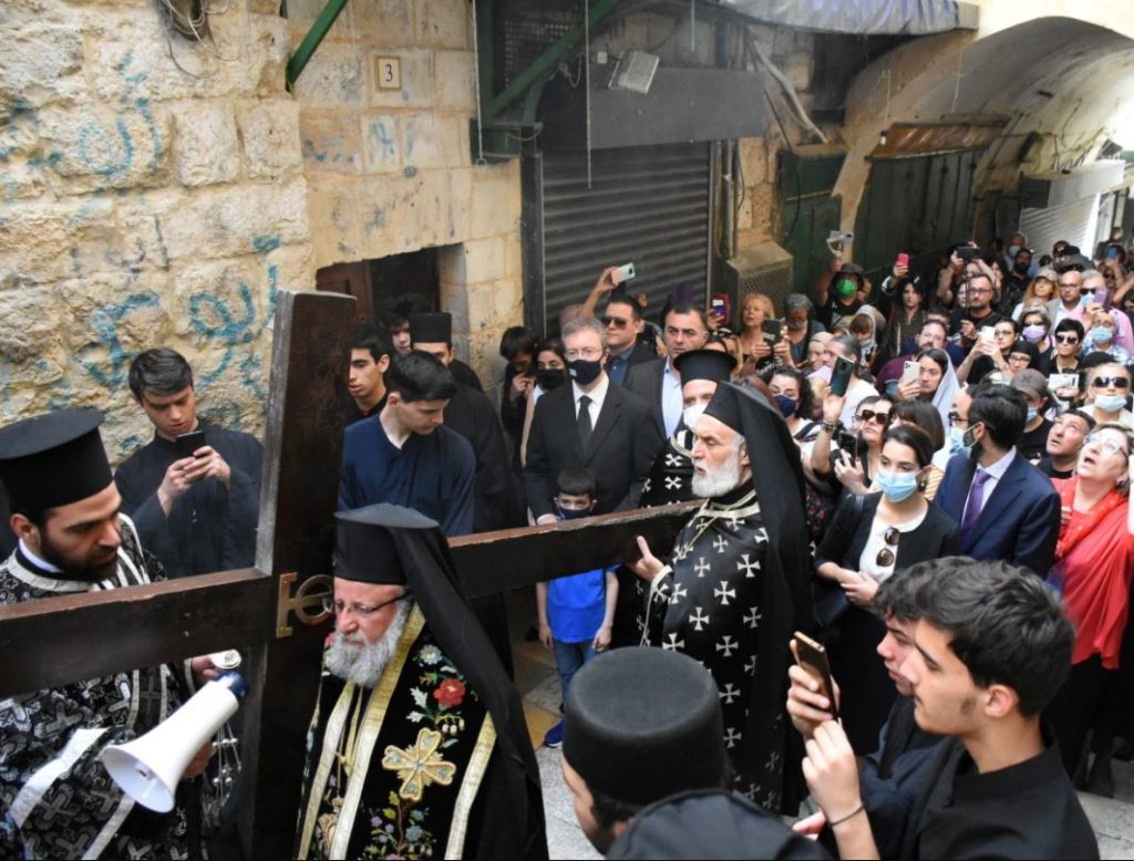Τῆς πορείας ταύτης ἡγήθη αἴρων τόν Σταυρόν ὁ Σεβασμιώτατος Ἀρχιεπίσκοπος Πέλλης κ. Φιλούμενος, ἀκολουθούμενος ὑπό Ἱερομονάχων, Μοναχῶν, μοναζουσῶν καί πολλῶν ἐντοπίων πιστῶν, παρουσίᾳ καί τοῦ Γενικοῦ Προξένου εἰς τά Ἱεροσόλυμα κ. Εὐαγγέλου Βλιώρα, πρός συμμετοχήν εἰς τό θεῖον Πάθος.
