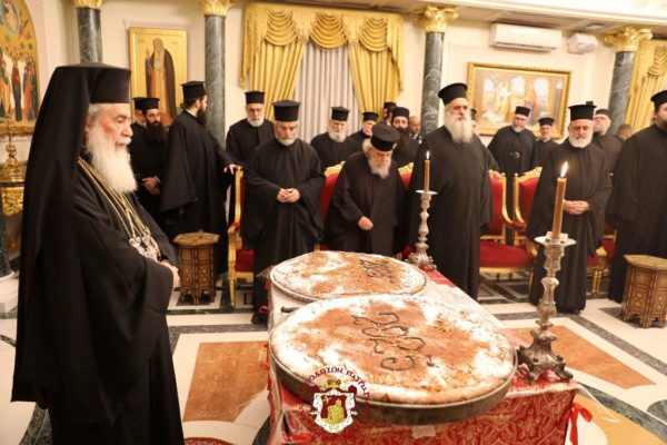 Με την ευχή και τις πρεσβείες προς τον Μέγα της Καππαδοκίας, Άγιο Βασίλειο τον Ουρανοφάντορα, για κατάπαυση του πυρός στην Γάζα και την δοκιμαζόμενη από πολέμους Μέση Ανατολή, πραγματοποιήθηκε η τελετή Κοπής της Βασιλόπιτας στο Πατριαρχείο Ιεροσολύμων.