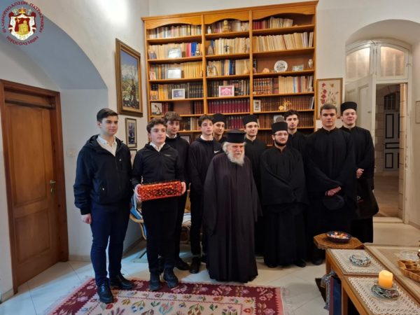 Οι μαθητές της Πατριαρχικής Σχολής έψαλαν παραδοσιακά κάλαντα από όλη την Ελλάδα και τα Πρωτοχρονιάτικα κάλαντα του Παναγίου Τάφου «εμείς η νέα γενεά του Παναγίου Τάφου…» και «Αρχιμηνιά και Αρχιχρονιά…» και ακολούθως εισήλθαν για τα κάλαντα και στις οικίες των Αγιοταφιτών Πατέρων κατά το έθιμο.