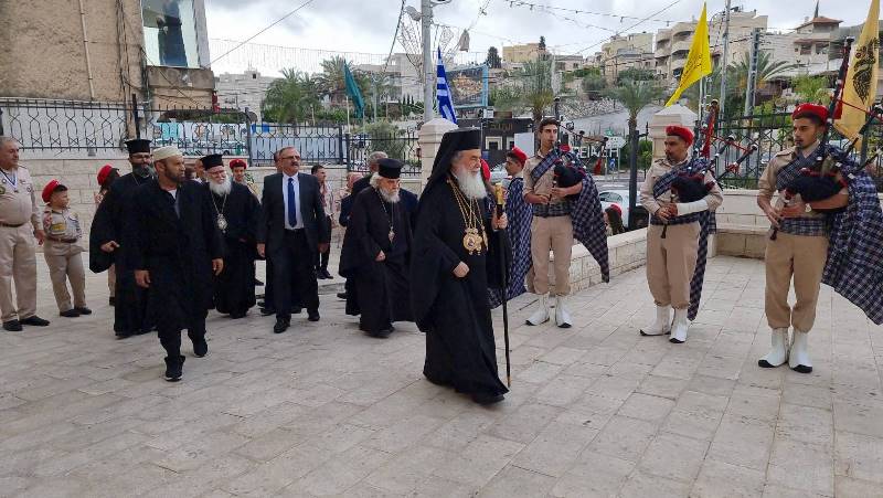 Πριν την έναρξη της Θείας Λειτουργίας οι Πρόσκοποι επεφύλαξαν θερμή υποδοχή στον Μακαριώτατο. Συλλειτούργησαν ο Σεβασμιώτατος Μητροπολίτης Ναζαρέτ κ. Κυριακός και ο Σεβασμιώτατος Αρχιεπίσκοπος Κωνσταντίνης κ. Αρίσταρχος, ο Γέρων Καμαράσης Αρχιμανδρίτης π. Νεκτάριος, ο εφημέριος του Ναού Αραβόφωνος Πρεσβύτερος π. Συμεών, Προϊστάμενος της Κοινότητος και άλλοι Πρεσβύτεροι όμορων Κοινοτήτων και ο Αρχιδιάκονος π. Μάρκος και ο Ιεροδιάκονος π. Ευλόγιος. Έψαλλε η χορωδία των ενοριτών της Κοινότητος.