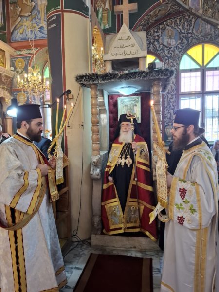 Εἰς τόν Ναόν τοῦτον ἐτέλεσε τήν θείαν Λειτουργίαν ὁ Μακαριώτατος Πατήρ ἡμῶν καί Πατριάρχης Ἱεροσολύμων κ.κ. Θεόφιλος, συλλειτουργούντων Αὐτῷ τοῦ Σεβασμιωτάτου Μητροπολίτου Καπιτωλιάδος κ. Ἡσυχίου, τοῦ Σεβασμιωτάτου Ἀρχιεπισκόπου Κωνσταντίνης κ. Ἀριστάρχου καί τοῦ Σεβασμιωτάτου Ἀρχιεπισκόπου Πέλλης κ. Φιλουμένου, Ἁγιοταφιτῶν Ἱερομονάχων ὡς τοῦ Ἡγουμένου τῆς Μονῆς τῶν Ποιμένων εἰς Μπετσαχούρ καί τῆς Μπετζάλλας Ἀρχιμανδρίτου π. Ἰγνατίου, τοῦ Ἡγουμένου τῆς Ἱ. Μονῆς τοῦ Σταυροῦ καί Γραμματέως τῆς Ἁγίας καί Ἱερᾶς Συνόδου Ἀρχιμανδρίτου π. Χριστοδούλου, Ἀραβοφώνων Πρεσβυτέρων, ὡς τῶν ἐφημερίων τοῦ Ναοῦ π. Σάββα, π. Ἤσσα καί π. Ἰωάννου, τῶν Ἱεροδιακόνων π. Εὐλογίου καί π. Ἀθανασίου, τῇ τιμητικῇ παρουσίᾳ τῆς Προξένου τῆς Ἑλλάδος εἰς Ἱεροσόλυμα κ. Ἄννης Μάντικα, ψαλλούσης τῆς Βυζαντινῆς χορῳδίας τῆς πόλεως καί μετέχοντος ἐν εὐλαβείᾳ καί προσευχῇ ἀθρόως τοῦ λαοῦ τῆς πόλεως.