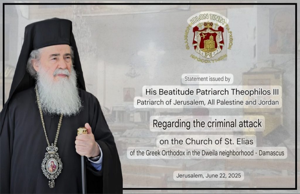 Τη βαθιά του θλίψη για την τρομοκρατική επίθεση στον Ιερό Ναό του Προφήτη Ηλία στη Δαμασκό το απόγευμα της Κυριακής, 22 Ιουνίου 2025, η οποία είχε ως αποτέλεσμα να χάσουν βίαια τη ζωή τους 22, τουλάχιστον, Ορθόδοξοι χριστιανοί και δεκάδες να τραυματιστούν, εξέφρασε με δήλωσή του ο Πατριάρχης Ιεροσολύμων κ.κ. Θεόφιλος.