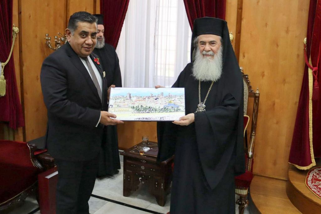 Στη σκιά των πολεμικών συγκρούσεων που μαίνονται στη Λωρίδα της Γάζας πραγματοποιήθηκε χθες, 1 Νοεμβρίου, στην έδρα του Πατριαρχείου Ιεροσολύμων, η συνάντηση του Πατριάρχη κ.κ. Θεοφίλου με τον Λόρδο Tariq Ahmad, βαρόνο Ahmad του Wimbledon, Υπουργό Επικρατείας του Ηνωμένου Βασιλείου για τη Μέση Ανατολή, τη Βόρεια Αφρική, τη Νότια Ασία και τα Ηνωμένα Έθνη στο Γραφείο Εξωτερικών, Κοινοπολιτείας και Ανάπτυξης.