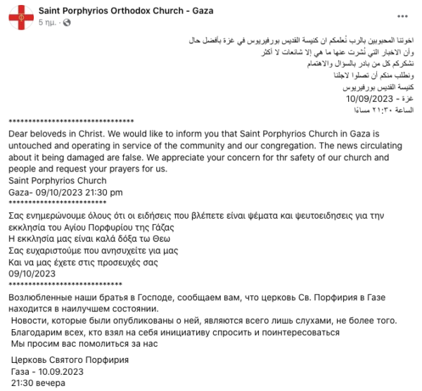 «Χθες το βράδυ ήταν 500 άτομα, σήμερα είναι 800» είπε ο Γέροντας Χρυσόστομος, ο οποίος επικοινώνησε με τον Σεβασμιώτατο Αρχιεπίσκοπο Τιβεριάδος και Πατριαρχικό Επίτροπο Γάζης κ. Αλέξιο. «Δεν μπορούν να φύγουν από εκεί γιατί αν φύγουν, θα τους σκοτώσουν οι Χαμάδες. Πρέπει να μείνουν εκεί. Τώρα τι θα γίνει, ο Θεός να βάλει το χέρι του», πρόσθεσε.