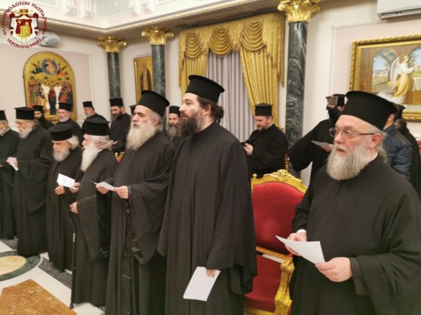 Μετά δε του υμνωδού είπωμεν: «Θεέ Θεών και Κύριε, τρισυπόστατε φύσις, απρόσιτε, αΐδιε, άκτιστε και των όλων Δημιουργέ Παντοκράτορ, σοι προσπίπτομεν πάντες, και σε καθικετεύομεν· το παρόν έτος τούτο, ως αγαθός, ευλογήσας φύλαττε εν ειρήνη, την Εκκλησίαν Σου, την Γεραράν Αγιοταφιτικήν ημών Αδελφότητα, το ευσεβές Χριστεπώνυμον ημών ποίμνιον, την αγίαν Πόλιν Ιερουσαλήμ και το ευσεβές γένος των Ρωμαίων Ορθοδόξων. Αμήν.