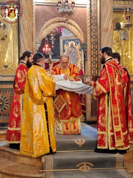Την κυριώνυμο ημέρα της εορτής τελέσθηκε θεία Λειτουργία στο Καθολικό του Πανιέρου Ναού της Αναστάσεως, προεξάρχοντος του Μακαριωτάτου Πατριάρχη Ιεροσολύμων κ.κ. Θεοφίλου, συλλειτουργούντων Αυτώ των Σεβασμιωτάτων Αρχιερέων Μητροπολίτου Καπιτωλιάδος κ. Ησυχίου, των Σεβασμιωτάτων Αρχιεπισκόπων Γεράσων κ. Θεοφάνους, Αβήλων κ. Δωροθέου, Σεβαστείας κ. Θεοδοσίου, Λύδδης κ. Δημητρίου, Καττάρων κ. Μακαρίου, Πέλλης κ. Φιλουμένου, Αγιοταφιτών Ιερομονάχων, ων πρώτος ο Γέρων Καμαράσης Αρχιμανδρίτης π. Νεκτάριος, ψάλλοντος του Πρωτοψάλτου και διακόνου π. Ευσταθίου Τσουμάνη, παρουσία του Γενικού Προξένου της Ελλάδος κ. Δημητρίου Αγγελοσοπούλου και μετέχοντος πλήθους πιστών και προσκυνητών.