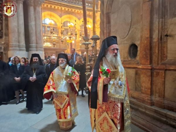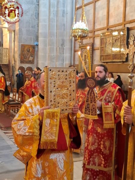 Την κυριώνυμο ημέρα της εορτής τελέσθηκε θεία Λειτουργία στο Καθολικό του Πανιέρου Ναού της Αναστάσεως, προεξάρχοντος του Μακαριωτάτου Πατριάρχη Ιεροσολύμων κ.κ. Θεοφίλου, συλλειτουργούντων Αυτώ των Σεβασμιωτάτων Αρχιερέων Μητροπολίτου Καπιτωλιάδος κ. Ησυχίου, των Σεβασμιωτάτων Αρχιεπισκόπων Γεράσων κ. Θεοφάνους, Αβήλων κ. Δωροθέου, Σεβαστείας κ. Θεοδοσίου, Λύδδης κ. Δημητρίου, Καττάρων κ. Μακαρίου, Πέλλης κ. Φιλουμένου, Αγιοταφιτών Ιερομονάχων, ων πρώτος ο Γέρων Καμαράσης Αρχιμανδρίτης π. Νεκτάριος, ψάλλοντος του Πρωτοψάλτου και διακόνου π. Ευσταθίου Τσουμάνη, παρουσία του Γενικού Προξένου της Ελλάδος κ. Δημητρίου Αγγελοσοπούλου και μετέχοντος πλήθους πιστών και προσκυνητών.