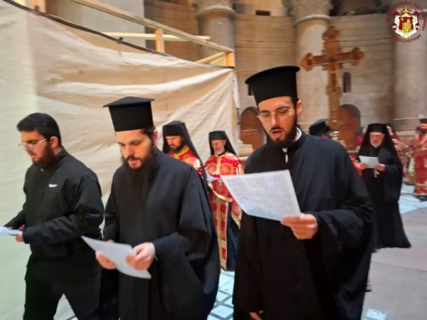 Την θεία Λειτουργία ακολούθησε η λιτανεία των Ιερών Εικόνων τρις πέριξ του Παναγίου Τάφου και ανά τα προσκυνήματα, μεθ’ ην ανεγνώσθη επί του Παναγίου Τάφου το Συνοδικόν της Ορθοδοξίας του Τριωδίου.