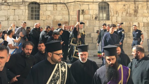 Στον αύλειο χώρο του Πανίερου Ναού της Αναστάσεως έγινε στάση με ομιλία του Αρχιεπισκόπου Μαδάβων κ. Αριστόβουλου.