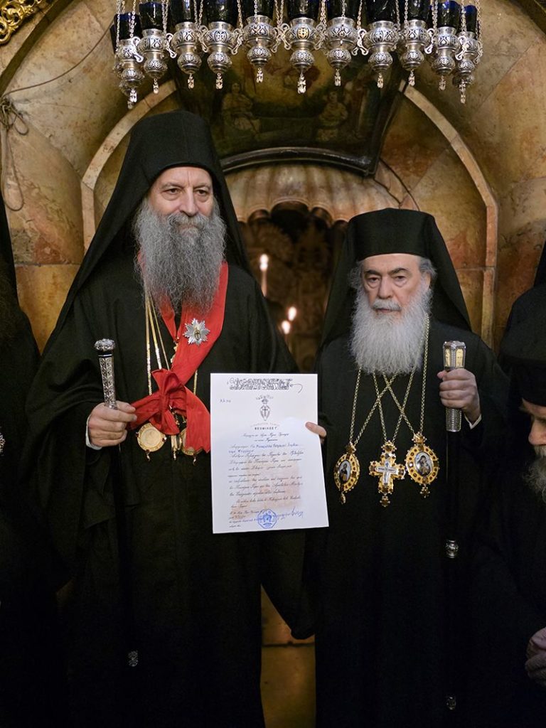 Ιστορική χαρακτηρίζεται για την Σερβική Εκκλησία η χθεσινή ημέρα, Τετάρτη 2 Απριλίου 2025, καθώς ο Προκαθήμενος αυτής, Μακαριώτατος Πατριάρχης κ.κ. Πορφύριος παρασημοφορήθηκε από τον Πατριάρχη Ιεροσολύμων κ.κ. Θεόφιλο αμέσως μετά το προσκύνημα το οποίο πραγματοποίησε στον Πανάγιο Τάφο.