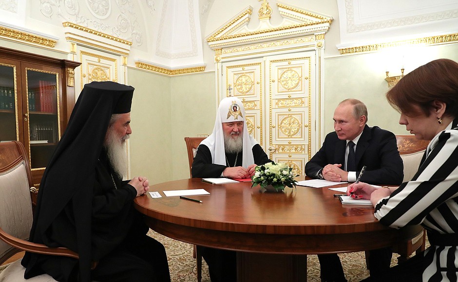 Με τον Ρώσο Πρόεδρο Βλαντιμίρ Πούτιν, παρουσία του Πατριάρχη Μόσχας κ.κ. Κυρίλλου, συναντήθηκε χθες στο Κρεμλίνο ο Μακαριώτατος Πατριάρχης Ιεροσολύμων κ.κ. Θεόφιλος.