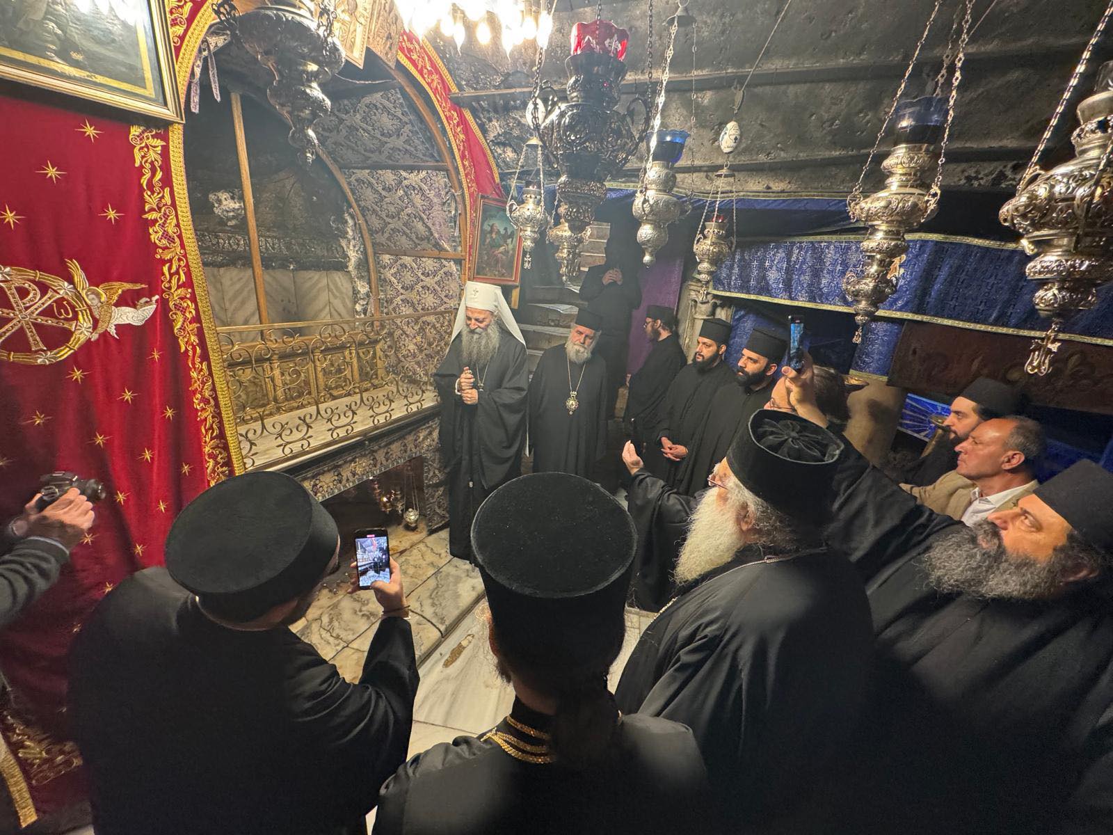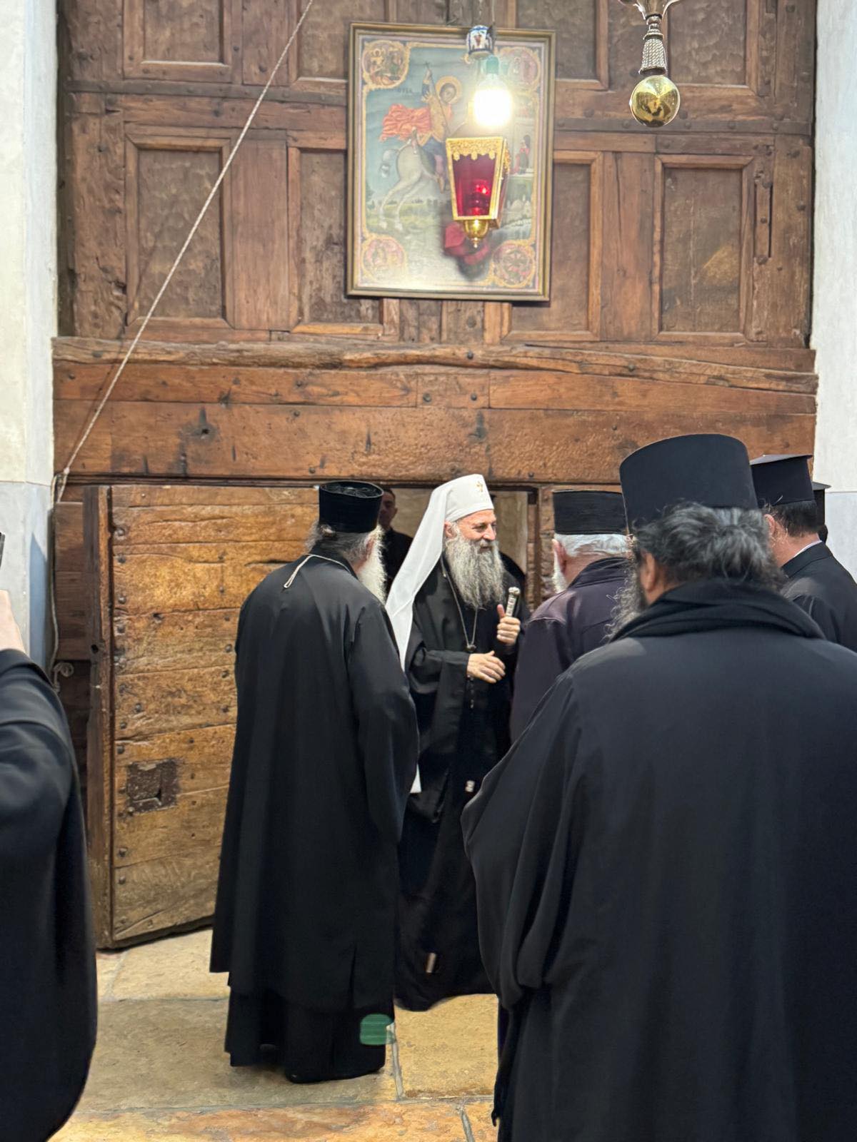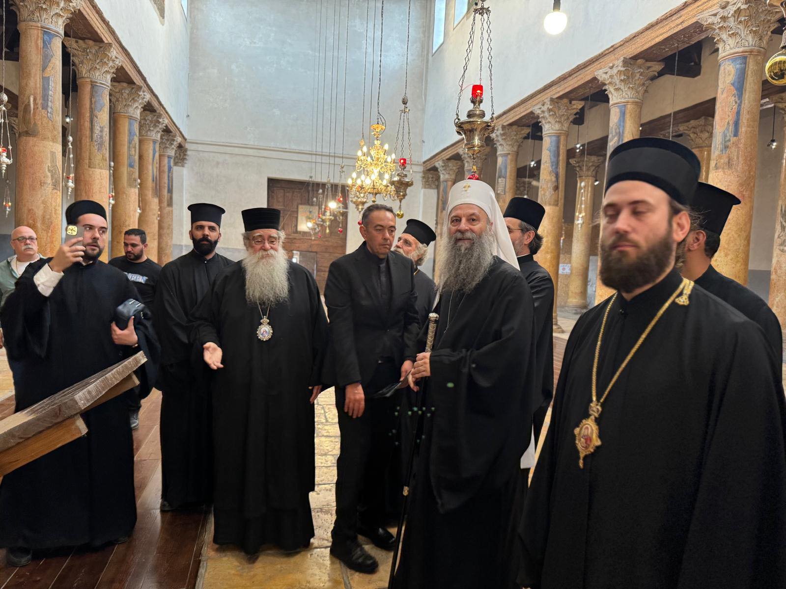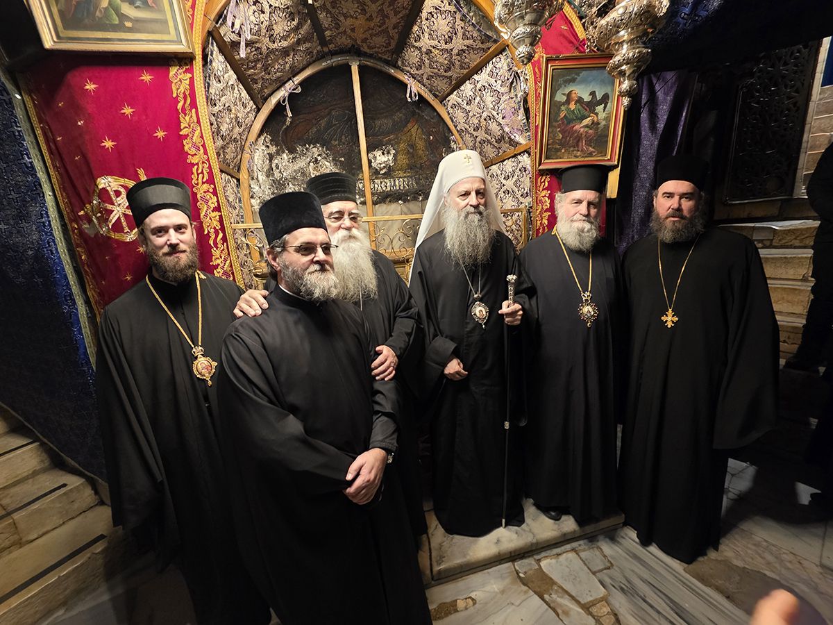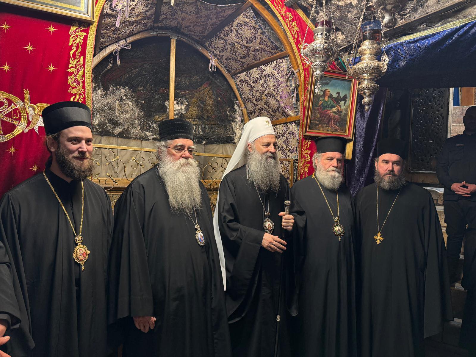 Το σημερινό προσκύνημα στα ιερά των Αγίων Τόπων έκλεισε με επίσκεψη του Μακαριωτάτου Πατριάρχη Σερβίας στη Βασιλική της Γεννήσεως στη Βηθλεέμ, στον τόπο όπου αποκαλύφθηκε το μεγάλο μυστήριο και η υπερβατική αγάπη του Θεού σε όλο τον κόσμο, στον τόπο της θαυματουργής Γέννησης του Υιού του Θεού, που έγινε άνθρωπος για χάρη μας και για τη σωτηρία μας.