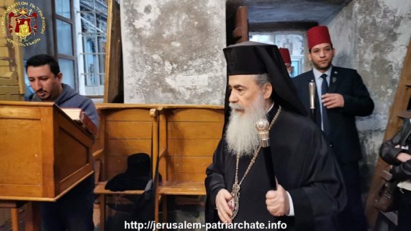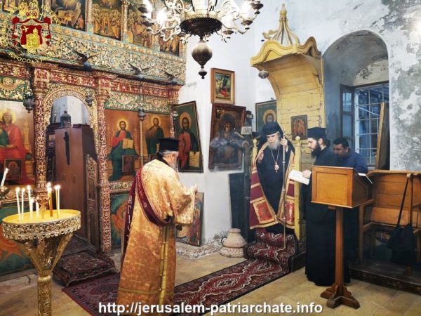 Κατά τη διάρκεια της θείας Λειτουργίας, επισκέφθηκε το παρεκκλήσιον ο Πατριάρχης Ιεροσολύμων κ.κ. Θεόφιλος και προσευχήθηκε υπέρ αναπαύσεως των αοιδίμων Πατριαρχών.