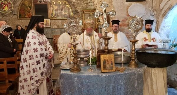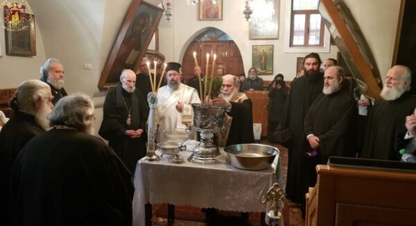 Προ του τέλους της θείας Λειτουργίας, εψάλησαν τα Τροπάρια «φωνή Κυρίου επί των υδάτων» και «σήμερον των υδάτων αγιάζεται η φύσις» και εν συνεχεία ετελέσθη η Ακολουθία του Μικρού Αγιασμού υπό του Μακαριωτάτου, ψαλλομένου του «Εν Ιορδάνη βαπτιζομένου Σου, Κύριε».
