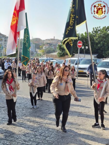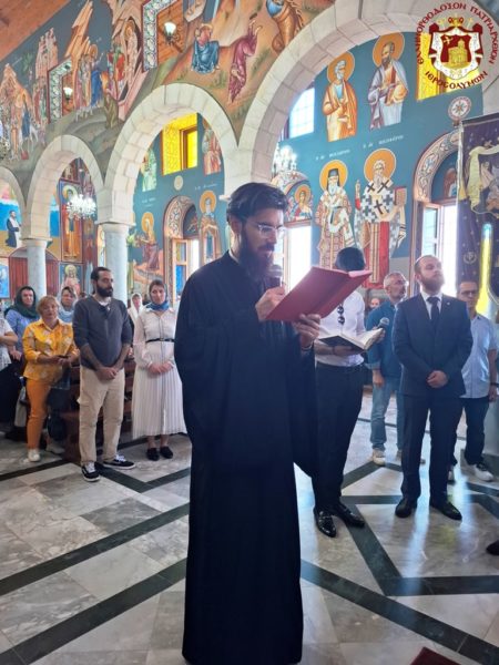 Έψαλλε στα ελληνικά ο Πρωτοψάλτης του Πανιέρου Ναού της Αναστάσεως, διάκονος π. Ευστάθιος, και στα αραβικά η χορωδία της Ιόππης.