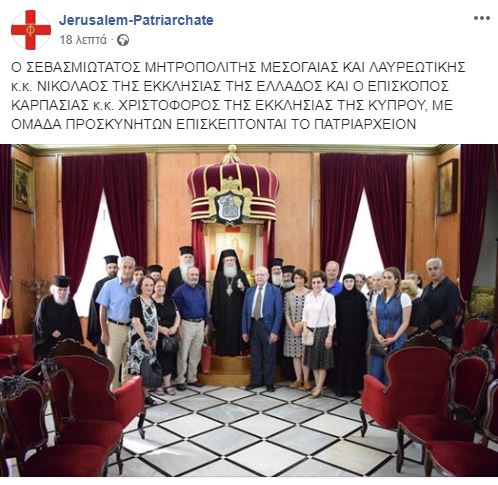 Ο Σεβασμιώτατος Μητροπολίτης Μεσογαίας και Λαυρεωτικής, κ. Νικόλαος, και ο Θεοφιλέστατος Επίσκοπος Καρπασίας, κ. Χριστοφόρος, μαζί με ομάδα προσκυνητών, επισκέπτονται το Πατριαρχείο Ιεροσολύμων, από όπου και η ως άνω αναμνηστική φωτογραφία.