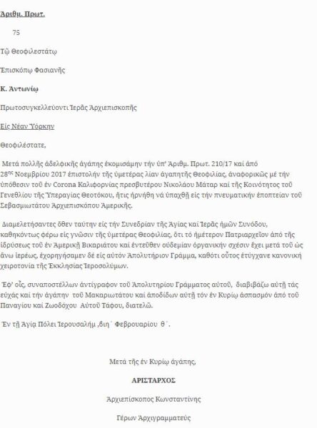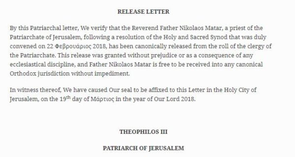 “Ο π. Νικόλαος Μάταρ, Προιστάμενος του Ιερού Ναού Γενεθλίου της Θεοτόκου εις την πόλιν Corona της πολιτείας Καλιφορνίας των Ηνωμένων Πολιτειών Αμερικής, εξακολουθεί ψευδώς να ισχυρίζηται ότι ενεργεί υπό την ευλογίαν και καθοδήγησιν του Πατριαρχείου Ιεροσολύμων παρά τα αναρτώμενα ενταύθα, Απολυτήριον Γράμμα, Release Letter, το οποίον εχορηγήθη αυτώ από του έτους 2018 και απεστάλη εις την κανονικήν Εκκλησιαστικήν αυτού Αρχήν, ήτοι τον Θεοφιλέστατον Επίσκοπον Φασιανής κ. Αντώνιον εις Νέαν Υόρκην. Το Πατριαρχείον Ιεροσολύμων καταγγέλλει την εκμετάλλευσιν του ονόματος αυτού και των ιστοσελίδων αυτού και προσεπιδηλοί ότι ουδεμίαν σχέσιν, συνεργασίαν ή επικοινωνίαν έχει μετά του Πατρός Νικολάου Μάταρ προς γνώσιν και ωφέλειαν του Ορθοδόξου ποιμνίου εν Αμερική και αλλαχού”, αναφέρει.