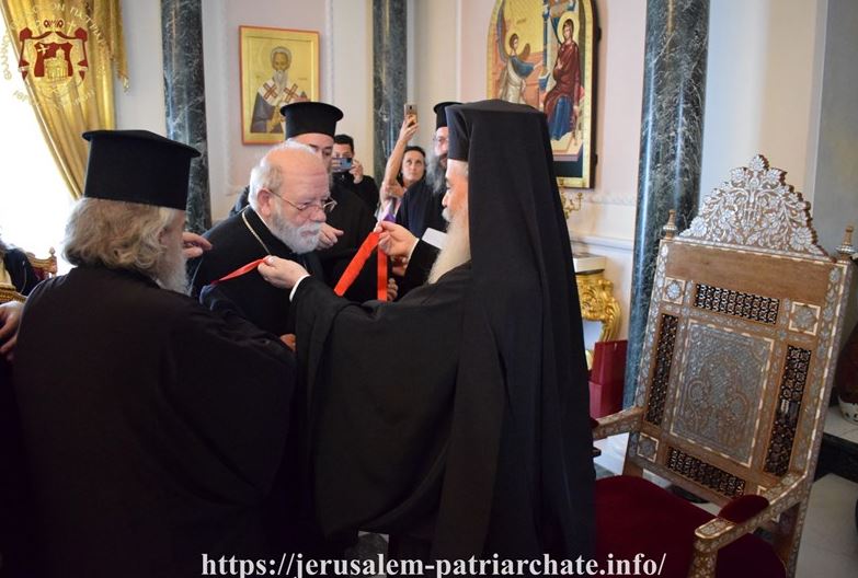 Με το παράσημο του Ανωτέρου Ταξιάρχου του Τάγματος των Ιπποτών του Παναγίου Τάφου ετίμησε ο Πατριάρχης Ιεροσολύμων κ. Θεόφιλος τον Μητροπολίτη Ανέων του Οικουμενικού Θρόνου, κ. Μακάριο, σε αναγνώριση «του σεβασμού και της συμπαραστάσεως αυτού προς το Πατριαρχείο Ιεροσολύμων»