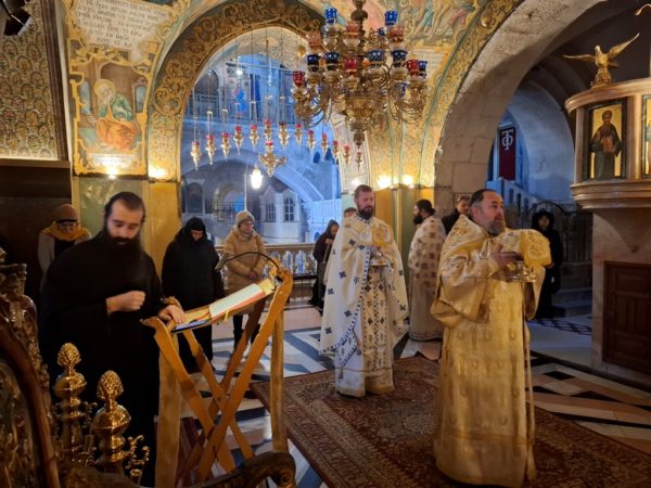 Μετά την θείαν Λειτουργίαν ετελέσθη το τεσσαρακονθήμερον Μνημόσυνον υπέρ αναπαύσεως της ψυχής του μακαριστού Αγιοταφίτου Αρχιμανδρίτου π. Ιεροθέου, ηγουμένου και ανακαινιστού της Ιεράς Μονής Αββά Θεοδοσίου του Κοινοβιάρχου, προεξάρχοντος του Μακαριωτάτου Πατρός ημών και Πατριάρχου Ιεροσολύμων κ.κ. Θεοφίλου και συνιερουργούντων Αυτώ των Σεβασμιωτάτων Αρχιεπισκόπων Λύδδης κ. Δημητρίου και Ιεραπόλεως κ. Ισιδώρου, του Γέροντος Καμαράση Αρχιμανδρίτου π. Νεκταρίου και του Γέροντος Δραγουμάνου Αρχιμανδρίτου π. Ματθαίου, του Αρχιμανδρίτου π. Χριστοδούλου και των προαναφερθέντων Ιερομονάχων της σειράς ταύτης, δεομένων υπέρ αναπαύσεως της ψυχής αυτού εν χώρα ζώντων μετά οσίων και δικαίων.