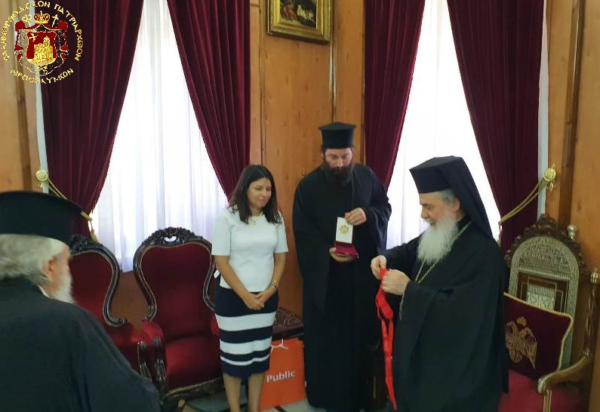 Την απερχόμενη Πρόξενο της Ελλάδος στα Ιεροσόλυμα, κ. Αικατερίνη Τζίμα, παρασημοφόρησε την Τρίτη 18 Αυγούστου ο Μακαριώτατος Πατριάρχης Ιεροσολύμων κ.κ. Θεόφιλος.