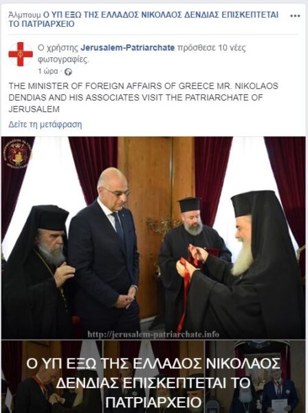 Ο Υπουργός Εξωτερικών της Ελλάδος, κ. Νικόλαος Δένδιας, μετά των συνεργατών του, σε επίκαιρη επίσκεψη στο Πατριαρχείο Ιεροσολύμων και τον Μακαριώτατο Πατριάρχη κ.κ. Θεόφιλο.