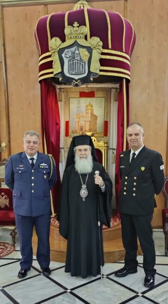 Βάσει της επισήμου ενημερώσεως εκ μέρους του Πατριαρχείου Ιεροσολύμων, οι αξιότιμοι Στρατιωτικοί Ακόλουθοι της Κυπριακής Πρεσβείας στο Τελ-Αβίβ, επισκέφθηκαν και πήραν την ευλογία του Μακαριωτάτου Πατριάρχου Ιεροσολύμων κ.κ. Θεοφίλου, από όπου παραθέτουμε σειρά φωτογραφικών στιγμιοτύπων.