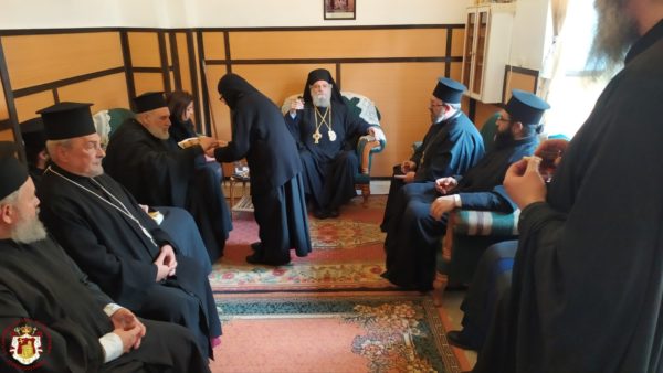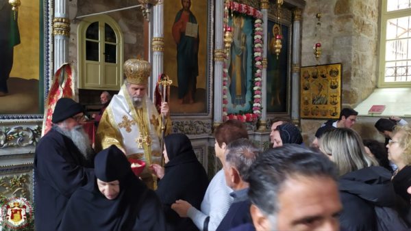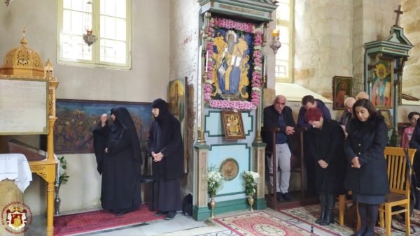 Μετά το πέρας της Θείας Λειτουργίας ο Ηγούμενος της Ιεράς Μονής Αρχιμανδρίτης π. Κάλλιστος δεξιώθηκε την Πατριαρχική και την Αρχιερατική συνοδεία καθώς και τους πιστούς στο ηγουμενείο και στο προαύλιο της Μονής.