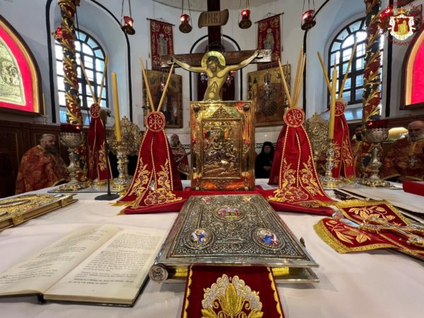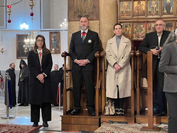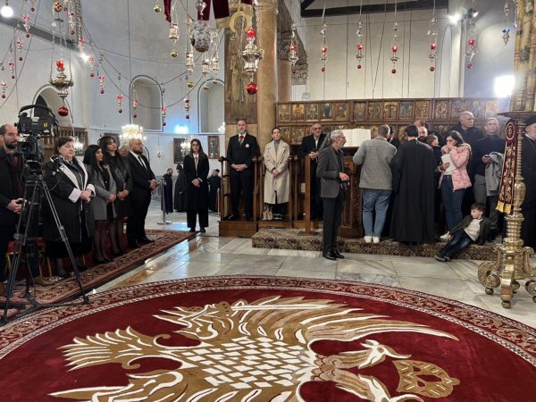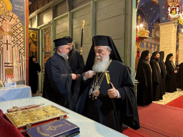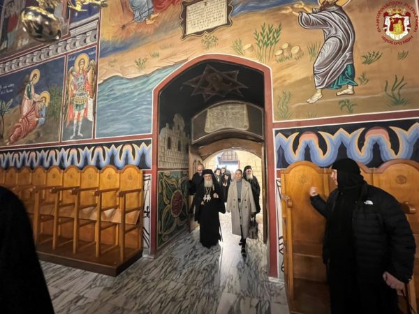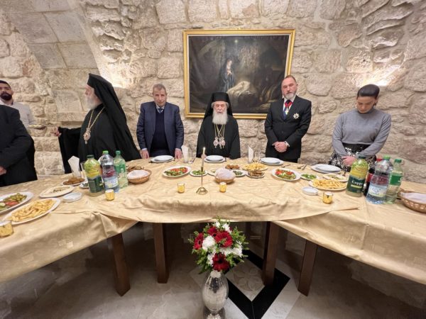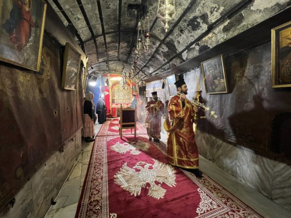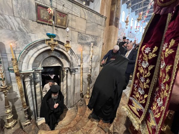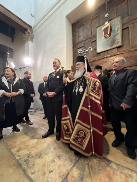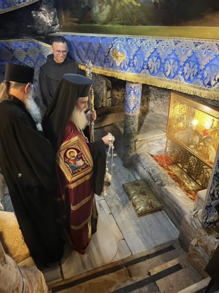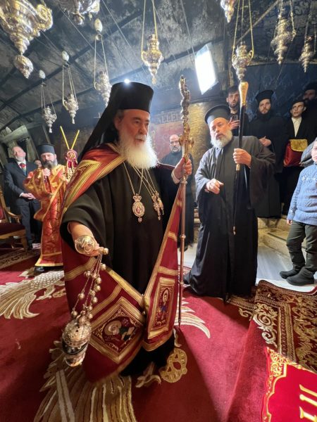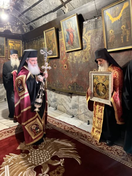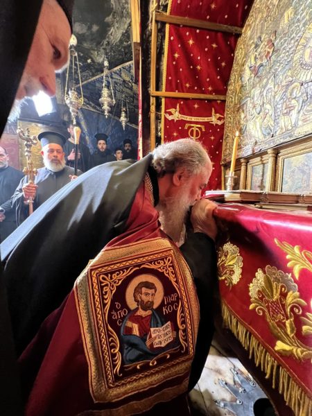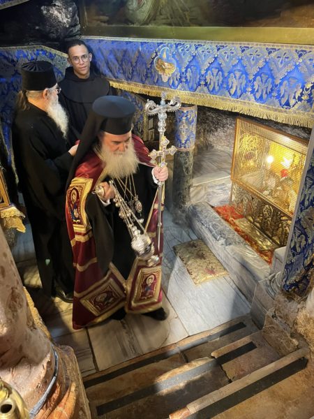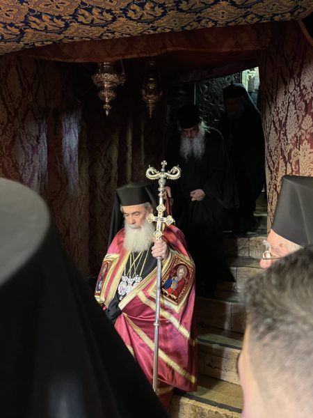 Εἰσελθών ὁ Μακαριώτατος εἰς τήν Βασιλικήν καί ἐν ᾧ δεξιά Αὐτοῦ ἵστατο ὁ Γενικός Πρόξενος τῆς Ἑλλάδος εἰς τά Ἱεροσόλυμα κ. Δημήτριος Ἀγγελοσόπουλος διῆλθε τό Καθολικόν, ὅπερ δικαίωμα μοναδικόν τῶν Ὀρθοδόξων, ἦλθεν εἰς τόν χῶρον πρό τοῦ εἰκονοστασίου καί ἐν συνεχείᾳ κατηυθύνθη πρός τό Θεοδέγμον Σπήλαιον διά τῆς νοτίου πύλης αὐτοῦ.