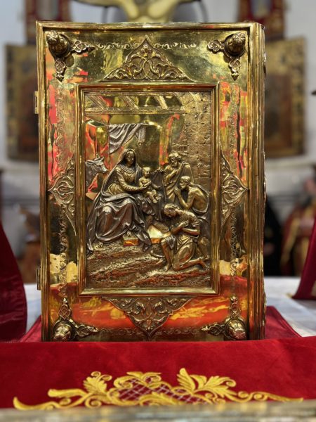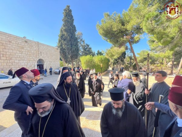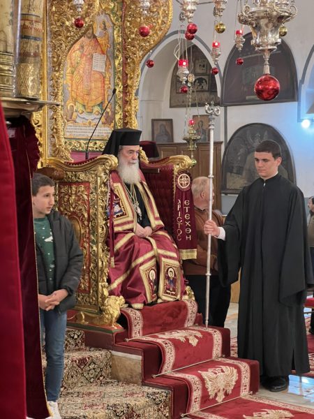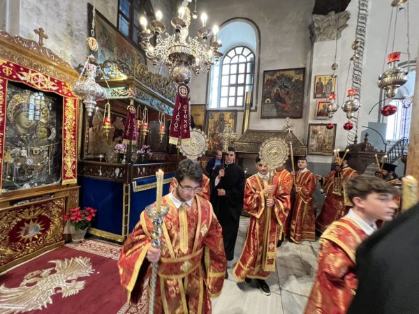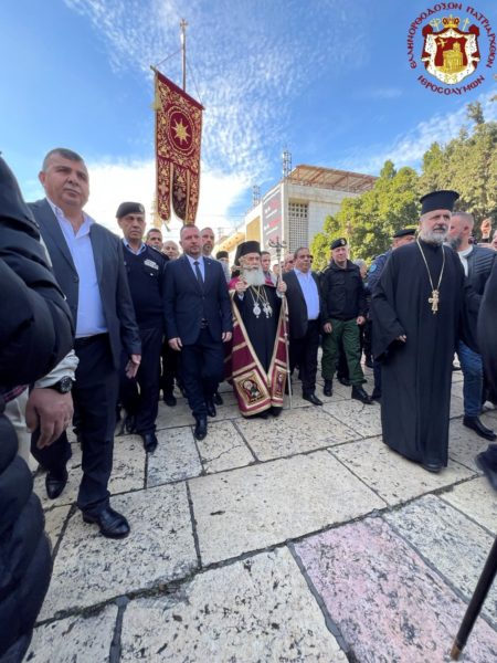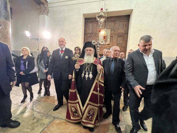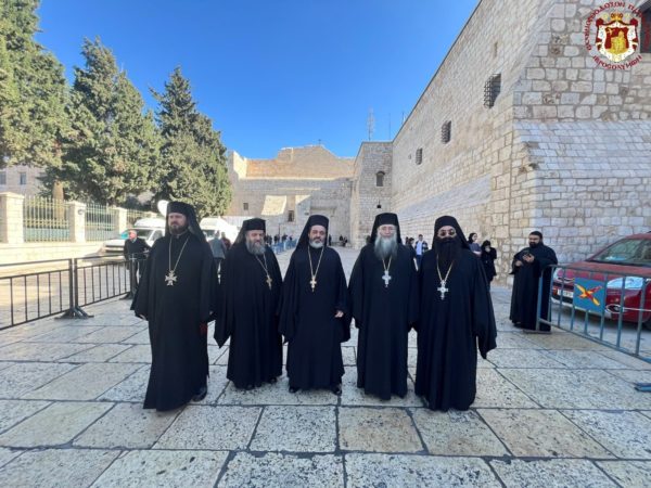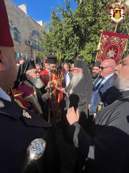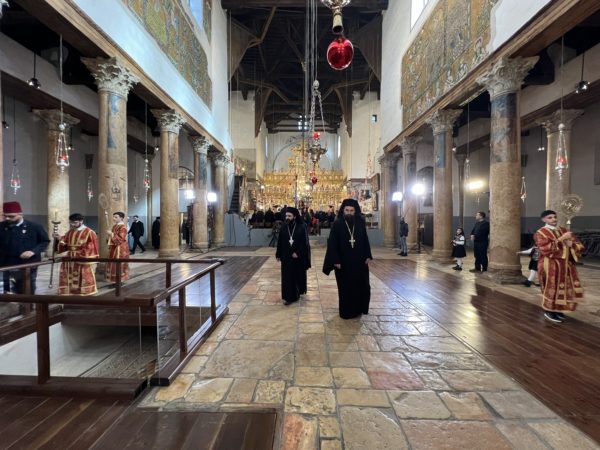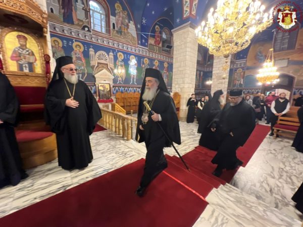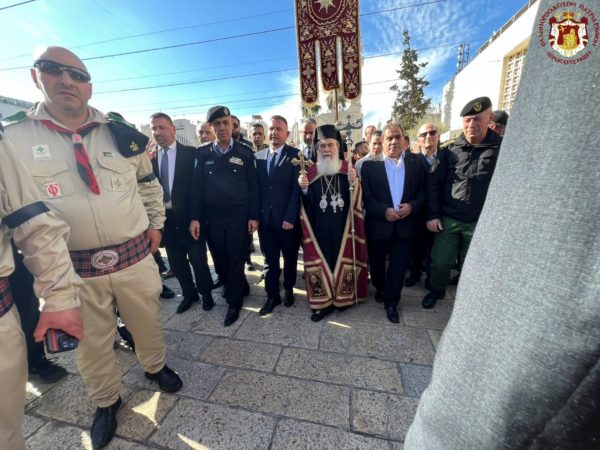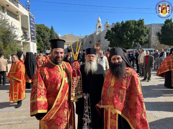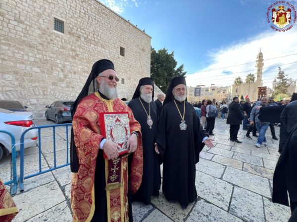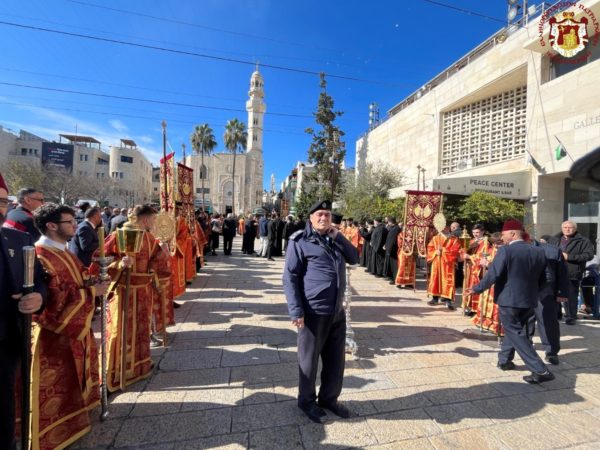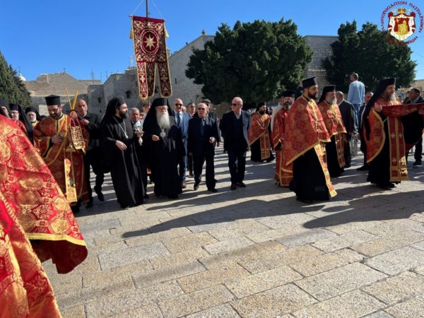 Βηθλεέμ ἡ Πατριαρχική Συνοδεία τῇ προπορεύσει ἐνδεδυμένων Ἱερέων κατηυθύνθη πρός τήν Πύλην τῆς Βασιλικῆς ἐν τῇ ψαλμῳδίᾳ ὑπό τῶν Ἱεροψαλτῶν τοῦ «Χριστός γεννᾶται δοξάσατε» καί τοῦ «ἡ Γέννησίς σου Χριστέ ὁ Θεός ἡμῶν ἀνέτειλε τῷ κόσμῳ τό φῶς τό τῆς γνώσεως».