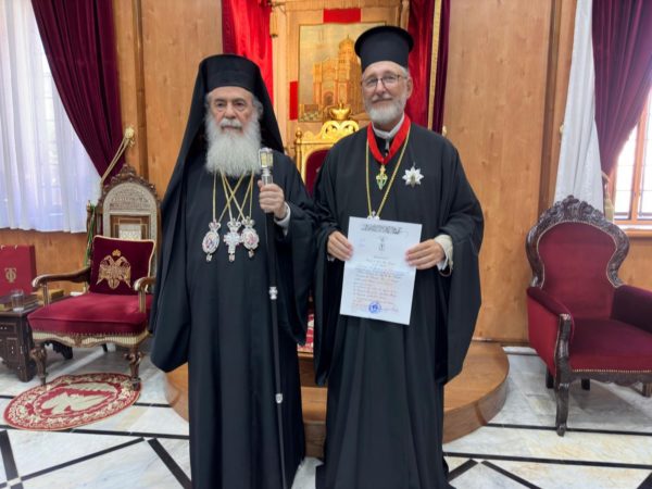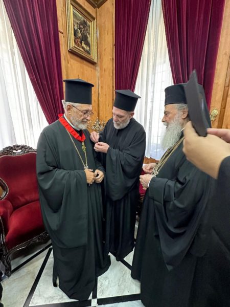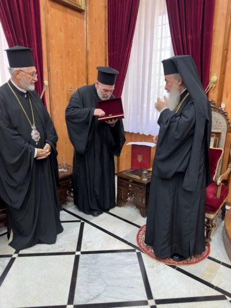 Στο πλαίσιο της επισκέψεως του Ιεράρχη του Οικουμενικό Θρόνου στο Πατριαρχείο Ιεροσολύμων, ο Μακαριώτατος Προκαθήμενος της Σιωνίτιδος Εκκλησίας κ.κ. Θεόφιλος απένειμε στον Θεοφιλέστατο την τιμητική διάκριση του Ανώτερου Ταξιάρχου του Τάγματος των Ιπποτών του Παναγία Τάφου.