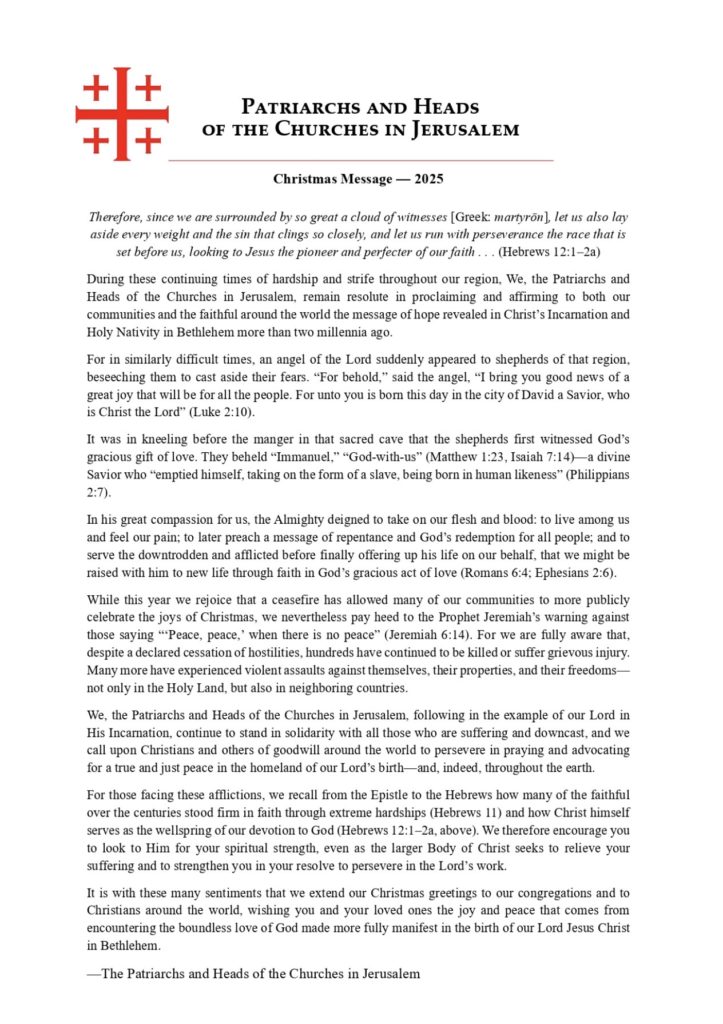 Το Μήνυμα ολοκληρώνεται με Χριστουγεννιάτικες ευχές προς τις τοπικές κοινότητες και τους Χριστιανούς σε όλο τον κόσμο, για χαρά και ειρήνη που πηγάζει από την άπειρη αγάπη του Θεού, όπως αυτή φανερώθηκε στη Γέννηση του Κυρίου Ιησού Χριστού στη Βηθλεέμ.