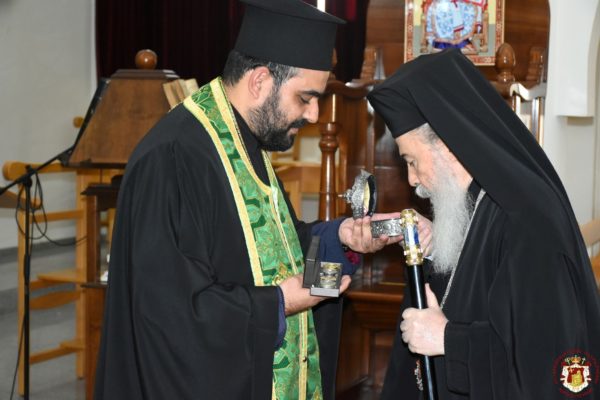 Μετά την απόλυση της θείας Λειτουργίας ακολούθησε κέρασμα, κατά το οποίον ο Μακαριώτατος, μεταξύ άλλων, στην προσφώνηση του ανέφερε ότι: “Αὐτήν ἀκριβῶς τήν μαρτυρίαν τῆς ἀγάπης, τῆς εἰρήνης καί τῆς ὁμονοίας μαρτυρεῖ καί διακονεῖ διά μέσου τῶν αἰώνων ἐν τῷ κόσμῳ καί μάλιστα ἐν τῇ μέσῃ Ἀνατολῇ καί ἐν τῇ Ἁγίᾳ Γῇ, ἡ Ἁγία τοῦ Χριστοῦ Ἐκκλησία τῶν Ἱεροσολύμων διά τῆς πνευματικῆς ἀποστολῆς καί τῆς μερίμνης τοῦ ποιμαντικοῦ αὐτῆς ἔργου· «Ὅτι οὗτός ἐστιν ὁ Θεός ἡμῶν εἰς τόν αἰῶνα καί εἰς τόν αἰῶνα τοῦ αἰῶνος· αὐτός ποιμανεῖ ἡμᾶς εἰς τούς αἰῶνας», (Ψαλμ. 47,15)”.