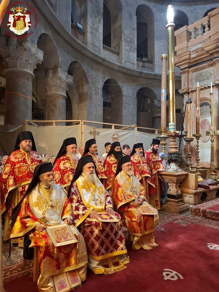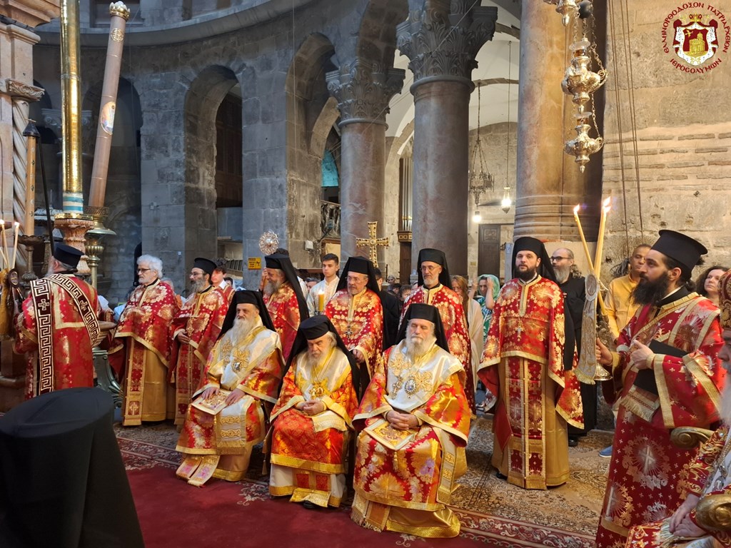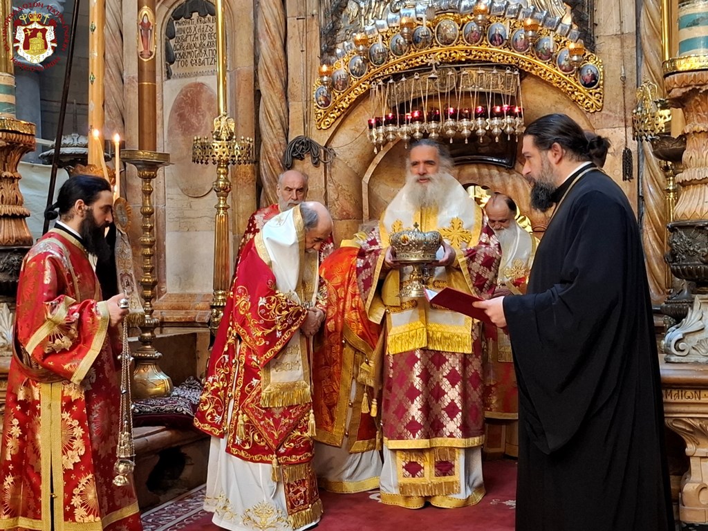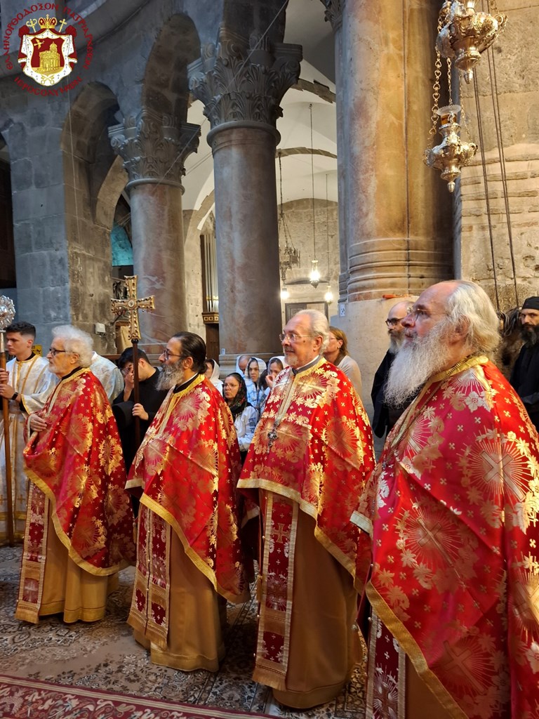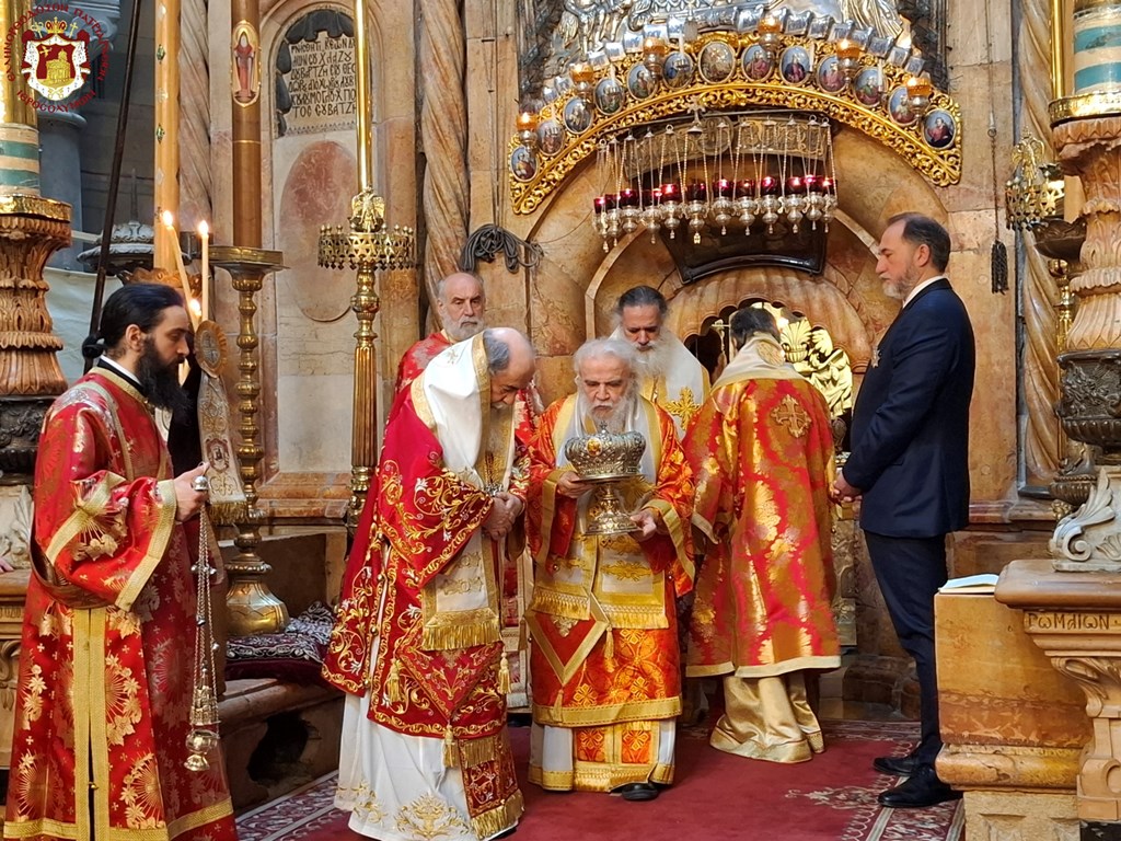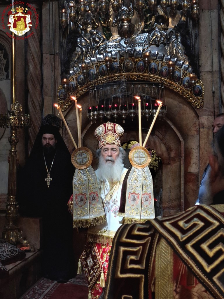 Διά τήν ἑορτήν ταύτην ἡ Α.Θ.Μ. ὁ Πατήρ ἡμῶν καί Πατριάρχης Ἱεροσολύμων κ.κ. Θεόφιλος προεξῆρξεν θείας Λειτουργίας εἰς τόν Πανάγιον καί Ζωοδόχον τοῦ Κυρίου Τάφον, συλλειτουργούντων Αὐτῷ τοῦ Σεβασμιωτάτου Μητροπολίτου Καπιτωλιάδος κ. Ἡσυχίου, τῶν Σεβασμιωτάτων Ἀρχιεπισκόπων Γεράσων κ. Θεοφάνους, Κωνσταντίνης κ. Ἀριστάρχου, Σεβαστείας κ. Θεοδοσίου, Λύδδης κ. Δημητρίου καί τοῦ Σεβασμιωτάτου Μητροπολίτου Ἑλενουπόλεως κ. Ἰωακείμ, Ἁγιοταφιτῶν Ἱερομονάχων ὧν πρῶτος ὁ Γέρων Καμαράσης Ἀρχιμανδρίτης π. Νεκτάριος, τοῦ Ἀρχιδιακόνου π. Μάρκου καί διακόνων, ἄλλων Ἱερέων ἐκπροσώπων τῶν Πατριαρχείων Ρωσίας καί Ρουμανίας, ψάλλοντος τοῦ Πρωτοψάλτου διακόνου π. Εὐσταθίου μετά τῶν μαθητῶν τῆς Πατριαρχικῆς Σχολῆς Σιών καί μετεχόντων εὐλαβῶν προσκυνητῶν καί Ἱεροσολυμιτῶν, τῇ τιμητικῇ παρουσίᾳ τοῦ Γενικοῦ Προξένου τῆς Ἑλλάδος εἰς τά Ἱεροσόλυμα κ. Δημητρίου Ἀγγελοσοπούλου.