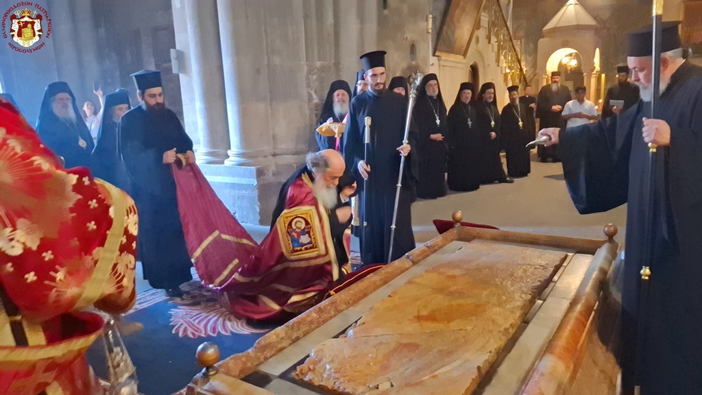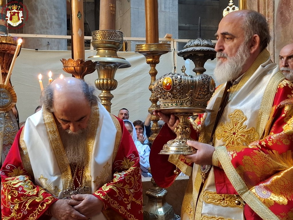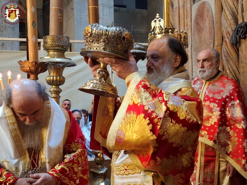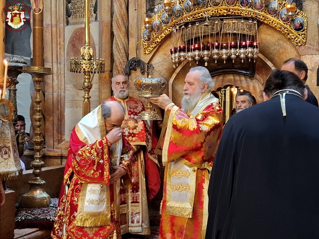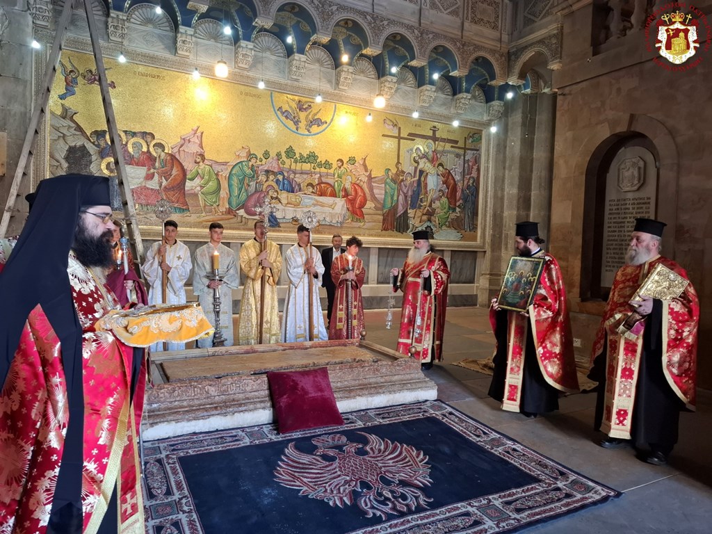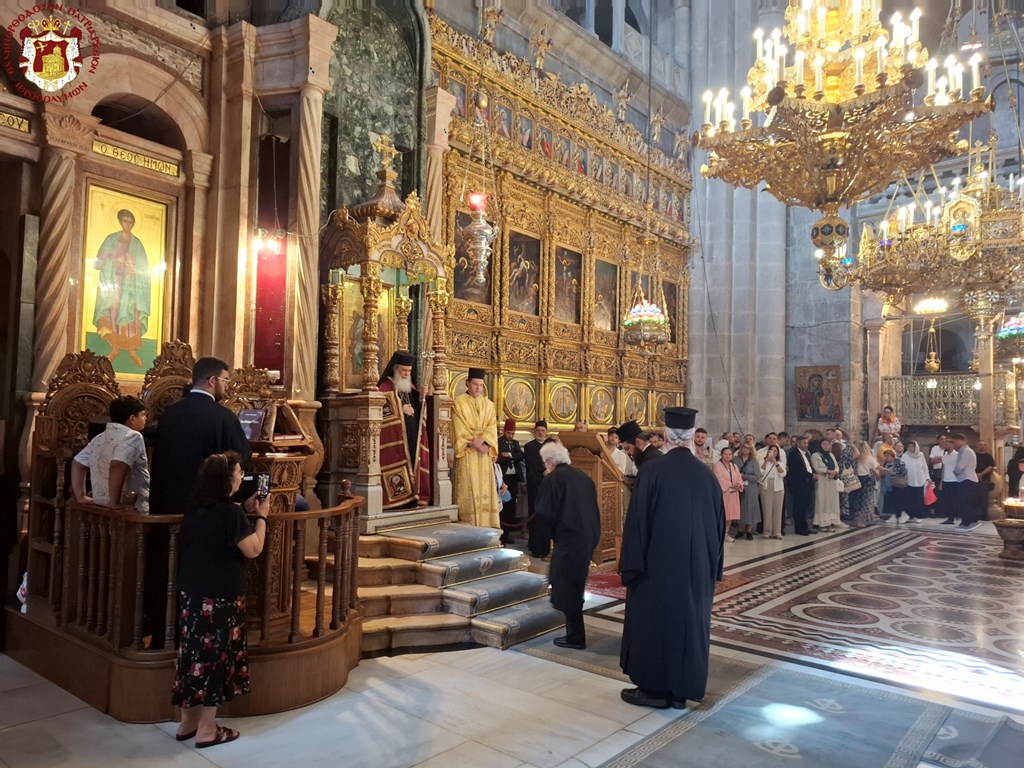 Διά τήν ἑορτήν ταύτην ἡ Α.Θ.Μ. ὁ Πατήρ ἡμῶν καί Πατριάρχης Ἱεροσολύμων κ.κ. Θεόφιλος προεξῆρξεν θείας Λειτουργίας εἰς τόν Πανάγιον καί Ζωοδόχον τοῦ Κυρίου Τάφον, συλλειτουργούντων Αὐτῷ τοῦ Σεβασμιωτάτου Μητροπολίτου Καπιτωλιάδος κ. Ἡσυχίου, τῶν Σεβασμιωτάτων Ἀρχιεπισκόπων Γεράσων κ. Θεοφάνους, Κωνσταντίνης κ. Ἀριστάρχου, Σεβαστείας κ. Θεοδοσίου, Λύδδης κ. Δημητρίου καί τοῦ Σεβασμιωτάτου Μητροπολίτου Ἑλενουπόλεως κ. Ἰωακείμ, Ἁγιοταφιτῶν Ἱερομονάχων ὧν πρῶτος ὁ Γέρων Καμαράσης Ἀρχιμανδρίτης π. Νεκτάριος, τοῦ Ἀρχιδιακόνου π. Μάρκου καί διακόνων, ἄλλων Ἱερέων ἐκπροσώπων τῶν Πατριαρχείων Ρωσίας καί Ρουμανίας, ψάλλοντος τοῦ Πρωτοψάλτου διακόνου π. Εὐσταθίου μετά τῶν μαθητῶν τῆς Πατριαρχικῆς Σχολῆς Σιών καί μετεχόντων εὐλαβῶν προσκυνητῶν καί Ἱεροσολυμιτῶν, τῇ τιμητικῇ παρουσίᾳ τοῦ Γενικοῦ Προξένου τῆς Ἑλλάδος εἰς τά Ἱεροσόλυμα κ. Δημητρίου Ἀγγελοσοπούλου.