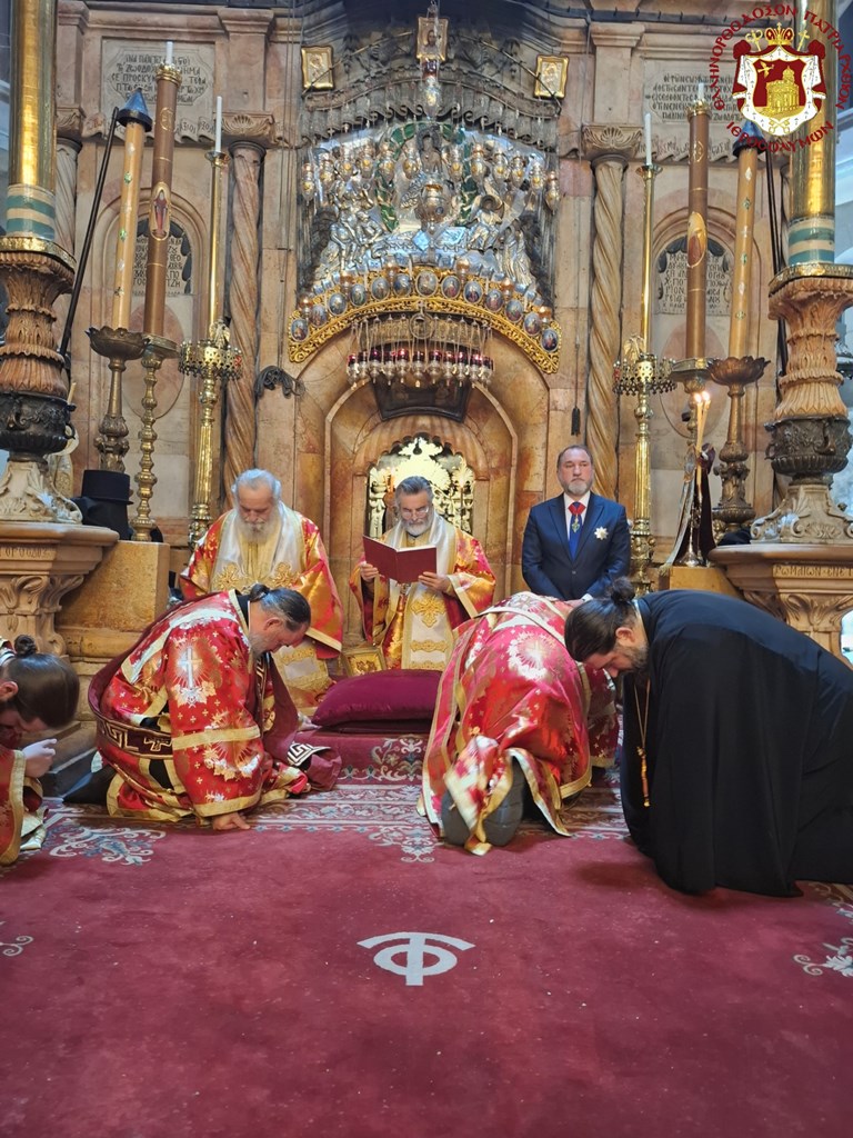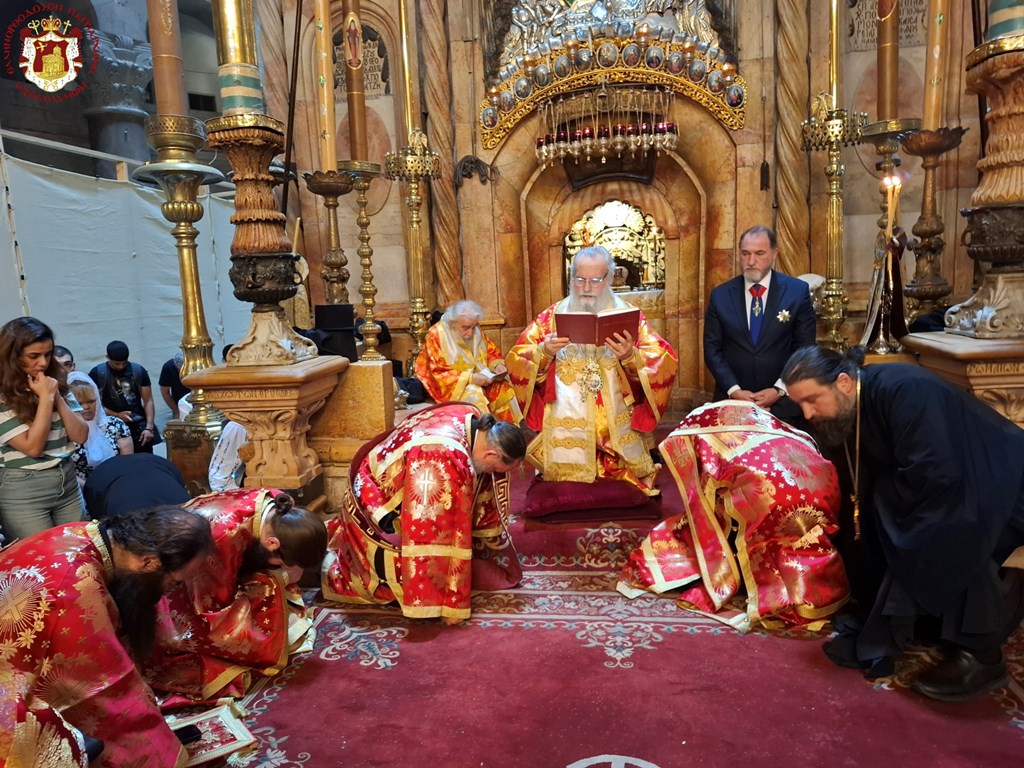 Της Θείας Λειτουργίας προέστη ο Πατριάρχης Ιεροσολύμων κ.κ. Θεόφιλος με τον οποίο συλλειτούργησαν Αγιοταφίτες Αρχιερείς και Πατέρες. Ακολούθως τελέστηκε ο Εσπερινός της Γονυκλισίας όπου διαβάστηκαν οι ευχές από τον Μακαριώτατο και τους Αρχιερείς.