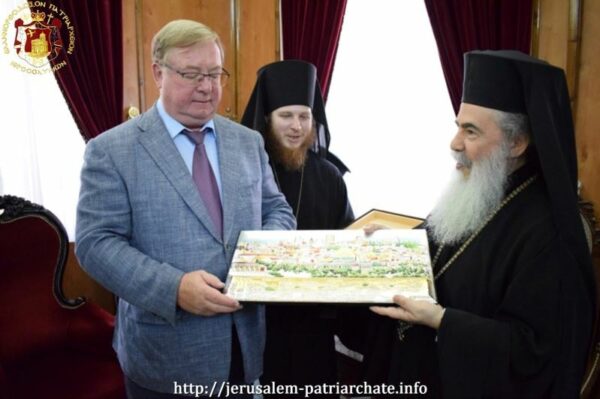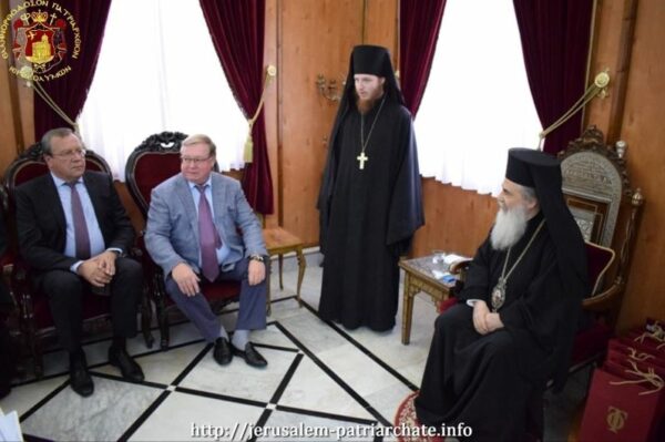 Επίσκεψη δέχτηκε χθες ο Μακαριώτατος Πατριάρχης Ιεροσολύμων κ.κ. Θεόφιλος από περίπου 2ο Προέδρους της Αυτοκρατορικής Ρωσικής Παλαιστινιακής Εταιρείας. Κατά την διάρκεια της συνάντησης ο Πατριάρχης ενημερώθηκε από επικεφαλής της αντιπροσωπείας για τη στήριξη της Εταιρείας προς τους εμπερίστατους χριστιανούς της Αγίας Γης.