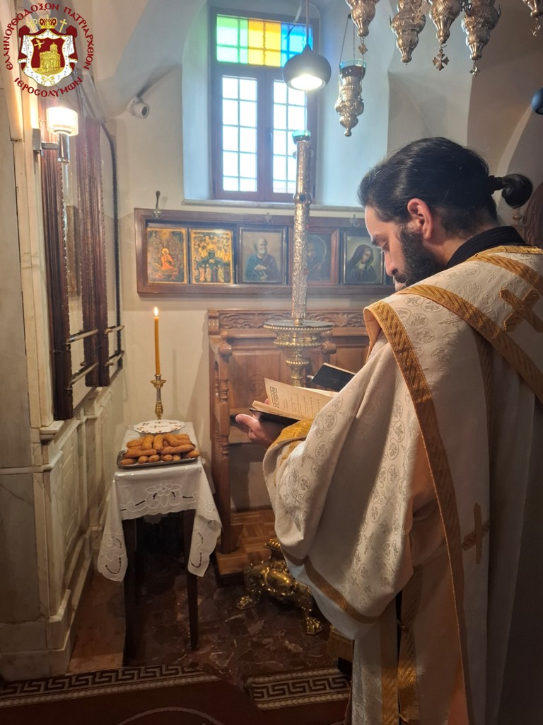 Διά τάς ψυχάς τῶν κεκοιμημένων Ἁγιοταφιτῶν Πατέρων καί τῶν μελῶν τῆς Ἑλληνικῆς Παροικίας Ἱεροσολύμων καί τῆς Αραβοφώνου Ἑλληνορθοδόξου Κοινότητος τοῦ Καθεδρικοῦ Ναοῦ τοῦ ἁγίου Ἰακώβου τοῦ Ἀδελφοθέου ἐτελέσθη θεία Λειτουργία εἰς τό παρεκκλήσιον τοῦ Κοιμητηρίου τῆς Ἁγίας Σιών, προεξάρχοντος τοῦ Πατριαρχικοῦ Ἐπιτρόπου Σεβασμιωτάτου Μητροπολίτου Καπιτωλιάδος κ. Ἡσυχίου, συλλειτουργοῦντος τῶν Ἱερέων π. Γεωργίου καί π. Νεκταρίου, ψαλλούσης τῆς χορῳδίας τῆς Πατριαρχικῆς Σχολῆς ἑλληνιστί καί τῆς χορῳδίας τοῦ Ἁγίου Ἰακώβου ὑπό τόν κ. Ριμόν Κάμαρ ἀραβιστί, τῶν πιστῶν προσκομιζόντων τά ὀνόματα τῶν κεκοιμημένων συγγενῶν αὐτῶν διά μνημόνευσιν”, αναφέρει το ανακοινωθέν της Αρχιγραμματείας.